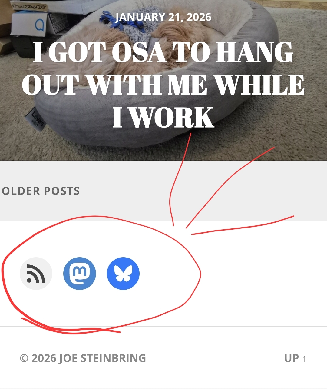 The three buttons at the bottom of this website, GIFs.JWS, and Photos.JWS now all work. You can follow any of them with the RSS feed, Mastodon, or Bluesky.